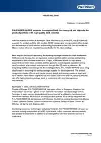 In 2015 PALFINGER acquired Norwegian Deck Machinery AS (NDM) and expanded its product portfolio with high deck winches and lifting and handling equipment. NDM, founded in 1989, was headquarted in Os, Norway. By the time of the acquisition, the company already held a prominent market position with its special winches, as well as lifting and handling equipment for offshore vessels, offshore service vessels, and oil rigs.